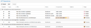 Standardmäßig ist das Enterprise-Repo aktiv, das ein kostenpflichtiges Abonnement erfordert. Für den Betrieb ohne Subscription müssen Sie das Enterprise-Repo deaktivieren und das No-Subscription-Repo hinzufügen.